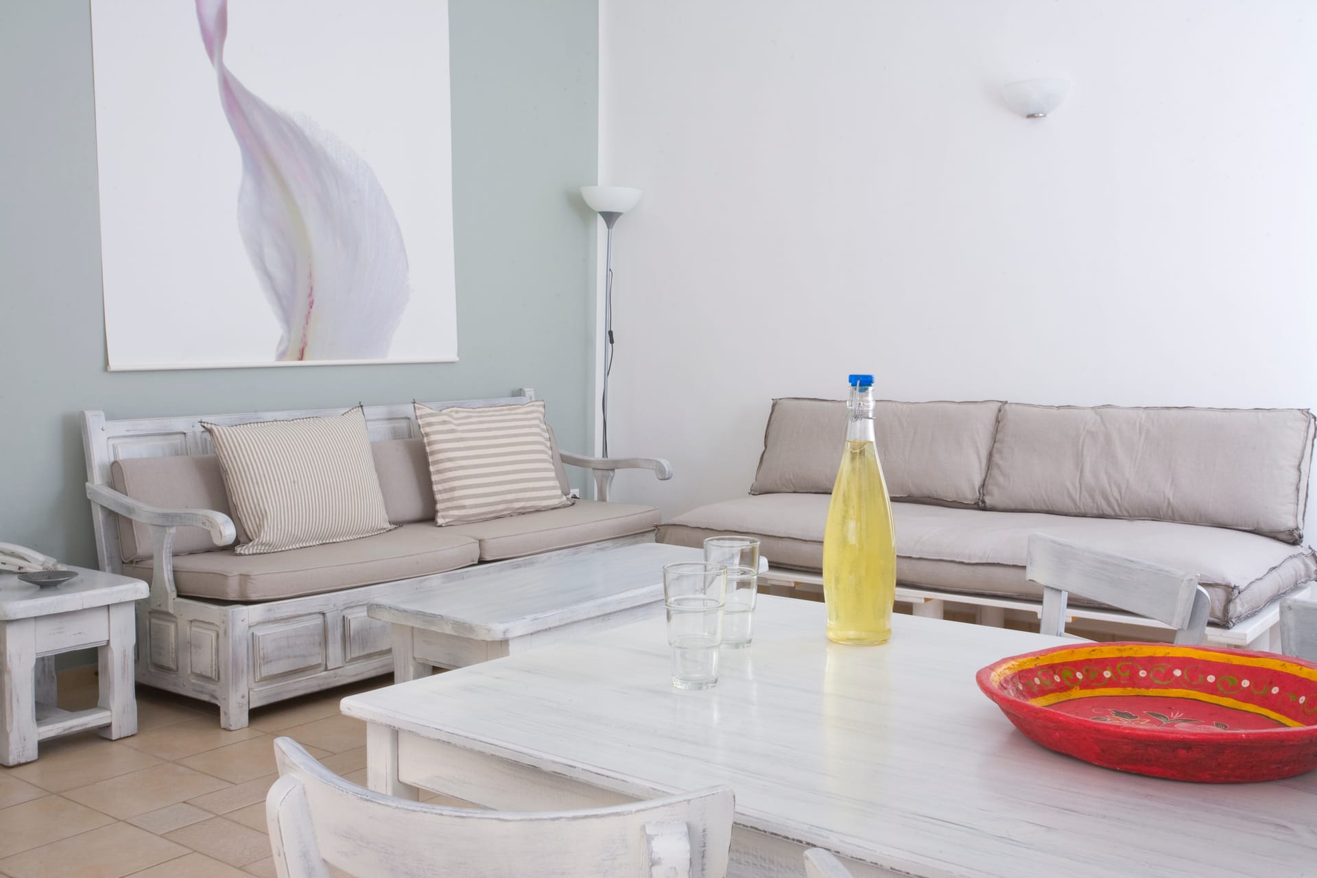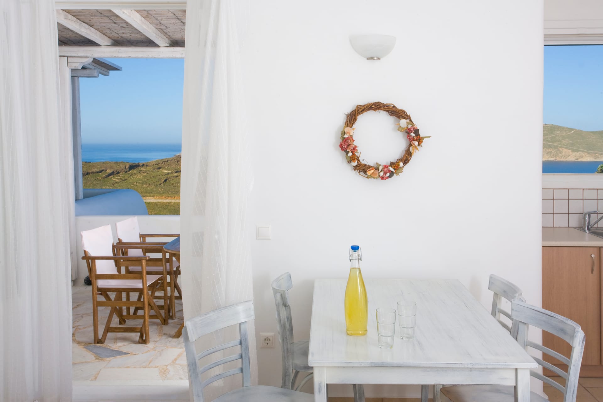 Ευρύχωρα διαμερίσματα που συνδυάζουν καλόγουστα Κυκλαδίτικα και μοντέρνα στυλ διακόσμησης. Προσφέρουν καταπληκτική θέα στον κήπο, την πισίνα, και το Αιγαίο Πέλαγος από τα ιδιωτικά επιπλωμένα μπαλκόνια ή αυλές τους. Όλα τα διαμερίσματα διαθέτουν κλιματισμό A/C, πλήρως εξοπλισμένη κουζίνα, δωρεάν Wi-Fi και LED TV. Μπορείτε να επιλέξετε δύο μονά ή ένα διπλό κρεβάτι. Υπάρχει η δυνατότητα φιλοξενίας τρίτου ατόμου σε μονό κρεβάτι στην κρεβατοκάμαρα ή σε καναπέ στο καθιστικό.